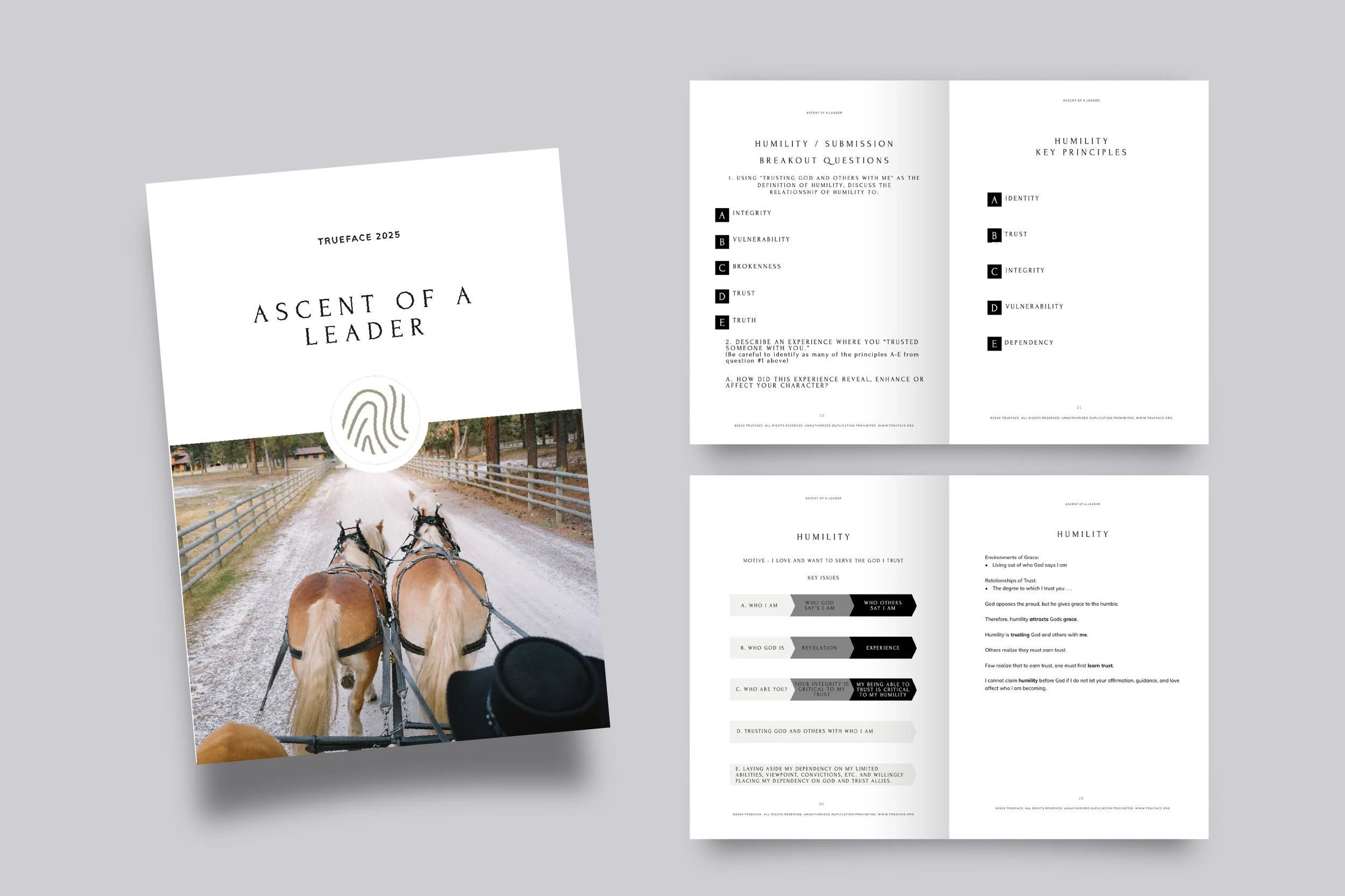 → This project included the design and layout of a custom cohort guide for TrueFace Ministries, created for a leadership retreat hosted at Petty Creek Mountain Ranch. The printed booklet served as both a welcome guide and spiritual companion, featuring a detailed schedule, session outlines, journal prompts, and ranch information. The design intentionally reflected the beauty and stillness of the Montana wilderness while staying aligned with TrueFace’s branding. Thoughtful formatting and clean typography supported a meaningful and distraction-free retreat experience.